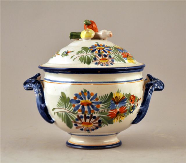 NEVERS. MONTAGNON. SOUPIÈRE CAMPAGNARDE RUSTIQUE en faïence, anses feuillagées et fretel en carotte, poireau et oignon traités au naturel. Décor polychrome de fleurs sur fond blanc et liseré bicolore.