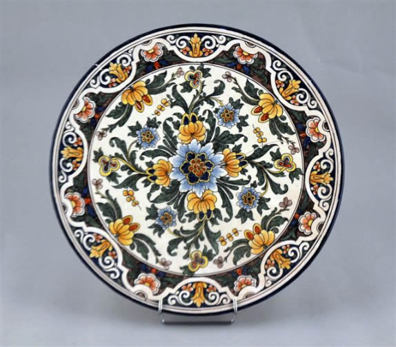 NEVERS. PLAT ROND en faïence, à décors polychrome rayonnant de fleurs et feuillages, dans les tons de bleu, jaune, vert, ocre et marron sur fond blanc. Frise d'arabesques et de fleurs sur le marli (restauration, retrait de cuisson).