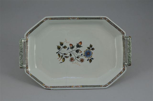 ROUEN. BANNETTE rectangulaire à pans en faïence à décor polychrome floral, anses latérales à motifs de volutes. XVIII-XIXème. Haut. 5,5, Long. 36,5, Larg. 24 cm (fêle avec réparation ancienne, sautes d'émail)