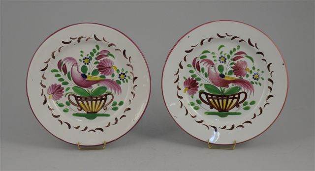 SAINT-CLÉMENT. Paire d'ASSIETTES en faïence. Décor au coq sur un panier de fleurs. Marque en bleu. XIX-XXème. Diam. 23 cm.