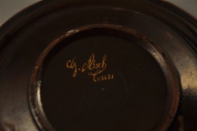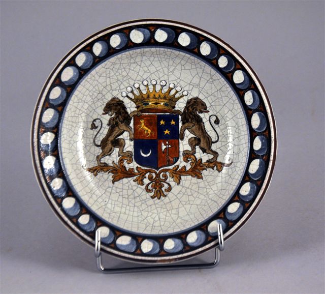 TOURS. COUPE HÉRALDIQUE en faïence à bord uni, à décor polychrome au centre d'un écu à la courrone de baron tenu par deux lions, sur l'aile d'une frise géométrique.