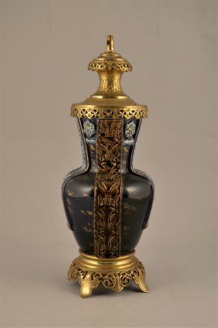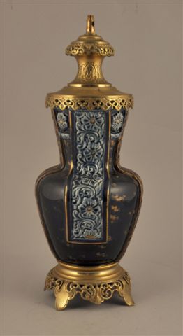 SARREGUEMINES (?). Grande LAMPE en grès montée à l'électricité, à décor moulé composée de quatre frises de fleurs en relief turquoise divisant le corps de la lampe sur un fond bleu profond rehaussé d'or. Monture florale ajourée en bronze.