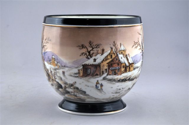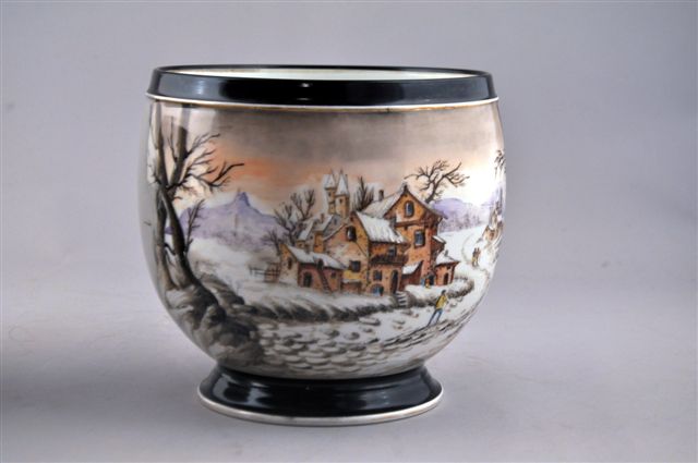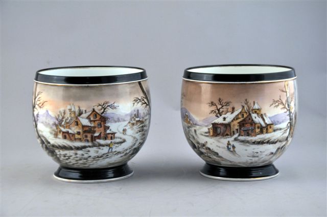 VIERZON ou PARIS (?). PAIRE DE CACHES-POTS en céramique, à décor de paysages sous la neige avec des personnages sur un chemin et des maisons. Des liserés noir en pied et au col rehaussent les paysages de neige. Manufacture HACHE (?), fin du XIXème siècle.