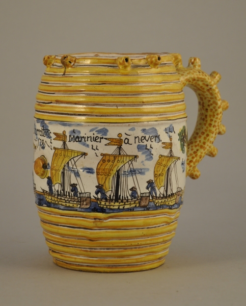NEVERS. Curieux PICHET en faïence en forme de tonneau, au dessus couvert repercé notamment d'une fleur de lys. Décor polychrome représentant sur la panse un train de gabarres de Loire avec inscription: " Etienne Barralons marinier à Nevers 1785 ". Dans l'état.