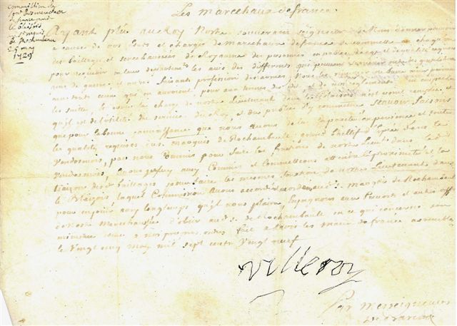 Commissions de lieutenant des Maréchaux de France dans le Vendômois délivrées à Joseph-Charles II de Vimeur, marquis de Rochambeau, père du maréchal.
