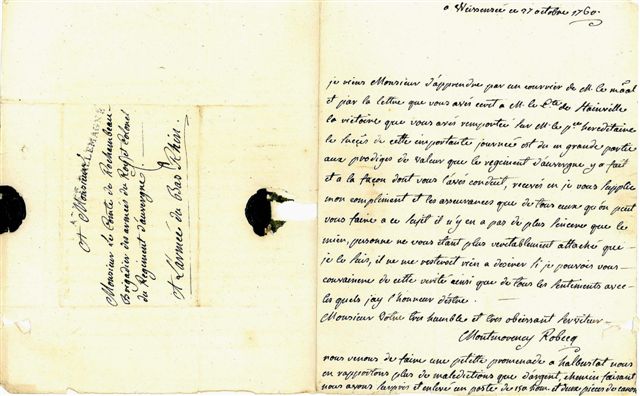 Je viens Monsieur d'apprendre par un courrier de M. le Maal et par la lettre que vous avez écrit à M. le Cte de Stainville la victoire que vous avez remportée sur M. le Pce héréditaire. Le succès de cette importante journée est du en grande partie aux prodiges de valeur que le régiment d'Auvergne y a fait et à la façon dont vous l'avez conduit, recevez en je vous supplie mon compliment (...)