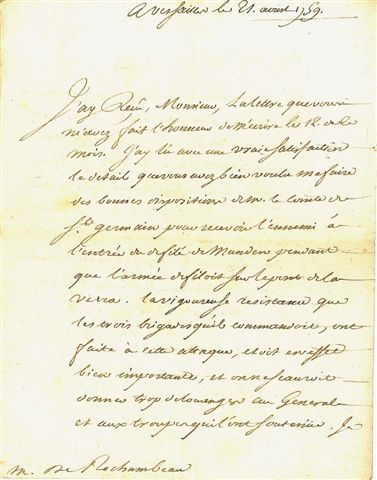 Bataille de Munden - Lettre au colonel de Rochambeau, commandant le régiment d'Auvergne pendant la guerre de Sept Ans.
