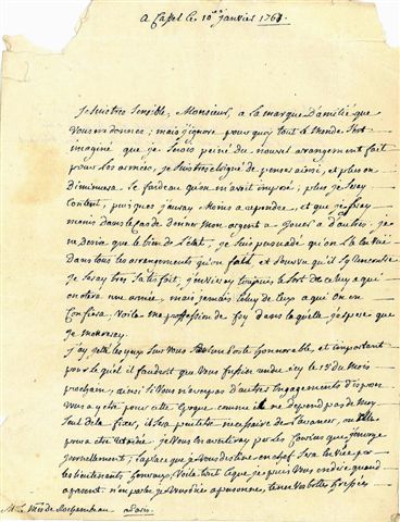 Victor François duc de BROGLIE (1718-1804) maréchal de France. L.A.S., Cassel 10 janvier 1761, au comte de Rochambeau, ; 1 page ¼ in-4, adresse (petits manques).