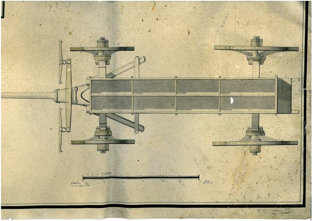 Plan d'un chariot de munitions tels qu'ils furent armés à l'infanterie en 1757. Dessin à la plume et aquarelle. 53 x 34 cm. Signé en bas à droite: « D.M.J. Rochambeau fecit ». Dans l'état.
