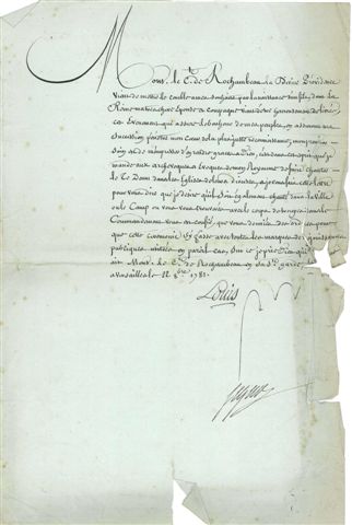 LOUIS XVI (1754-1793) Roi de France. 2 L.S. (secrétaire), contresignées par Philippe Henri marquis de SÉGUR (1724-1801) maréchal de France et secrétaire d'état à la Guerre, Versailles 22 octobre et 26 novembre 1781 ; 2 pages in-fol. (déchirures à la première).