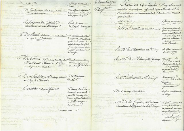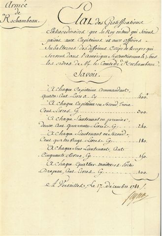 Avec un tableau exposant l'Etat des gratifications extraordinaires que le Roy entend qui soient payées aux capitaines et aux officiers subalternes des différents corps de troupes qui servent dans l'Amérique septentrionale, sous les ordres de M. le Comte de Rochambeau.
