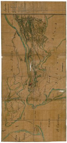 Plan des environs de New-York - Position du camp de l'armée combinée à Philippsburg du 6 juillet au 19 août [1781]. Calque en 14 sections montées sur toile et pliées, formant une carte de 103 x 48 cm (petits manques). Légendes.