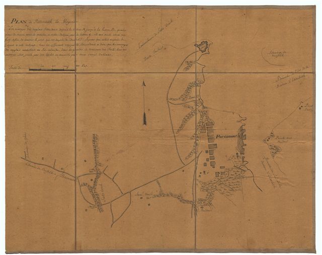 Plan de Portsmouth en Virginie. Calque en 6 sections montées sur toile et pliées, formant une carte de 41,5 x 33 cm. Légendes. Plan manuscrit figurant les ouvrages défensifs des anglais.
