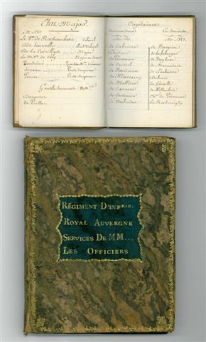 Donatien Marie Joseph de Vimeur, vicomte de ROCHAMBEAU. Manuscrit, Régiment royal d'Auvergne. Etat des services de Messieurs les Sous-officiers ; services de Messieurs les Officiers. 2 volumes, reliure d'époque veau granité, 50 pages in-8 et 18 pages in-32. 1788.