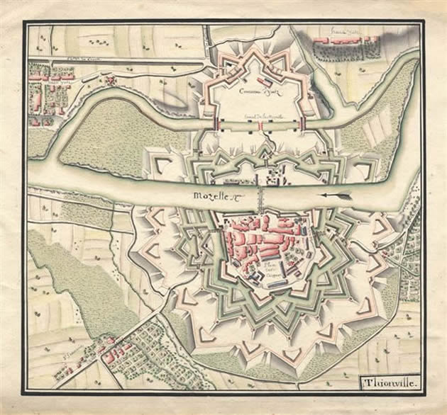 Plan de la ville et des fortifications de Thionville en Moselle, plume et aquarelle, 25,5 x 24 cm.