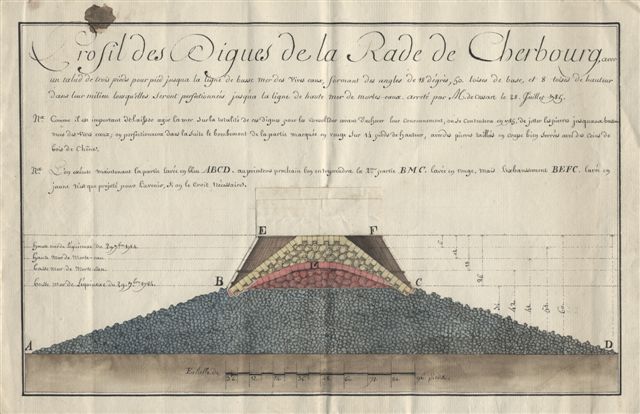 Profil des digues de la rade de Cherbourg, plume et aquarelle, 36,5 x 24 cm.