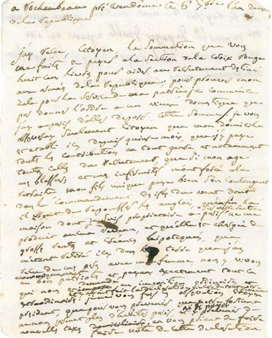 À la Section révolutionnaire de la Croix Rouge à Paris. J'ai reçu citoyen la sommation que vous me faites de payer à la section de la Croix-Rouge huit cent livres pour aider au recrutement destiné aux armées de la République ; pour prouver mon zèle pour le service de la patrie, je commence par donner l'ordre à un vieux domestique que j'ay à Paris d'aller déposer cette somme. Je vous observeray seulement citoyen que mon domicile est établi ici depuis 15 mois, que j'y paye toutes les contributions en tout genre et notamment toutes celles du recrutement, que si mon âge, mes blessures et mes infirmités m'ont forcé à la retraite, mon fils unique paye bien son contingent dans le commandement des isles du Vent dont il vient de repousser les Anglais, qu'enfin la maison dont je suis propriétaire à Paris sur votre section ne m'a produit aucun revenu, et qu'elle est chargée de grosses rentes et créances hypothéquées, que m'étant retiré ici dans la terre que j'ai reçu de mes pères avec ma femme, nous y vivons économiquement en bons patriotes et payons exactement tout ce qui nous est demandé en impositions ordinaires et extraordinaires. (...) La Maréchale ajoute: parce qu'il nous est impossible de payer double à Paris et ici, notre maison aitant déjà chargé d'imposition exactement payé chaque anné