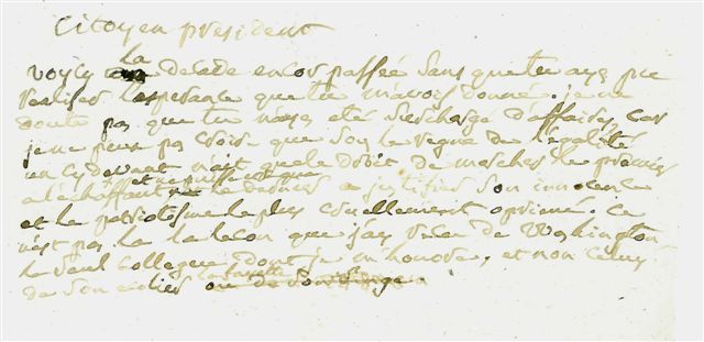 Citoyen président, voici la décade encore passée sans que tu aies pu réaliser l'espérance que tu m'avais donné. Je ne doute pas que tu n'aies été surchargé d'affaires car je ne peux pas croire que sous le règne de l'égalité un ci-devant [maréchal] n'ait que le droit de marcher le premier à l'échafaud et ne puisse être que le dernier à justifier son innocence et le patriotisme le plus cruellement opprimé. Ce n'est pas là la leçon que j'ai reçu de Washington, le seul collègue dont je m'honore et non celui de son écolier Lafayette [ou de son singe].