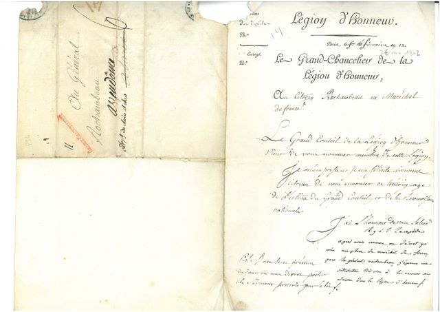 ) Après avoir concouru au décret qui créa une place de maréchal de France, pour le général Rochambeau, j'éprouve une satisfaction très vive à lui annoncer son admission dans la légion d'honneur.