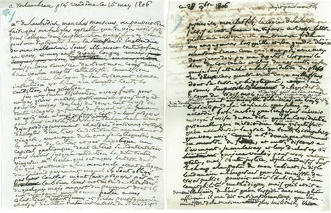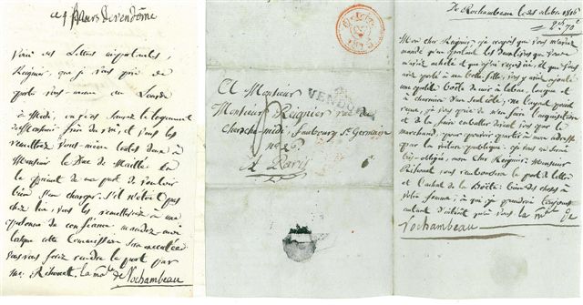 Minutes autographes de correspondances adressées à son fils, à sa belle-fille et autres, relatives aux difficultés financières que sa belle-fille rencontre par la captivité du général Rochambeau en Angleterre, au contentieux entre le maréchal et sa belle-fille au sujet de la vente du château de Renay et ses terres, aux affaires relatives à la succession.