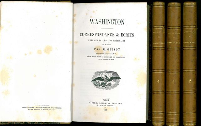 George WASHINGTON. Correspondances et écrits extraits de l'édition américaine mis en ordre par M. Guizot et traduits de l'anglais par M. Ch. Pour faire suite à l'histoire de Washington par M. Cornelis de Witt. (Paris, Didier, 1855). 4 vol. rel. in-8 ½ chagr. ép., dos à nerfs, rouss.