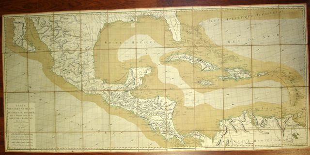 Carte des Isles Antilles et du golfe du Mexique avec la majeure partie de la nouvelle Espagne. Par M. Bonne, août 1780. En 44 sections montées sur toile et pliées, formant une carte de 148 x 69 cm. Gravure, à Paris, chez Lattré.