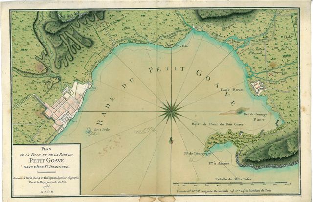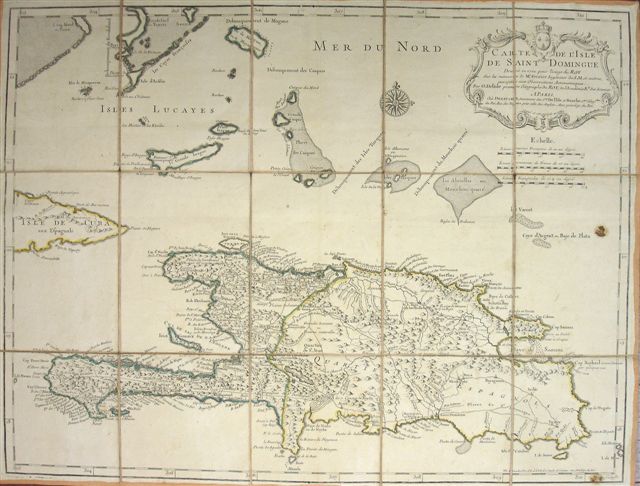 JOINT: Carte de l'Isle de Saint-Domingue, 1780, en 15 sections montées sur toile et pliées, formant une carte de 59 x 50 cm. ; en mauvais état et manques. - Plan de la ville et de la rade du Petit Goave dans l'Isle de Saint-Domingue, et Plan de la baye et du bourg de Tiburon dans l'Isle de Saint-Domingue, par Phélipeau, 1786, gravures, 40 x 26,5 cm. - Carte de l'isle de Saint-Domingue. 1780, en 15 sections montées sur toile et pliées, formant une carte de 66 x 50 cm., gravure, chez Dezauche à Paris, 2 exemplaires dont un en mauvais état.