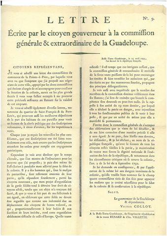 10 pièces imprimées: Proclamation de la loi du 4 avril 1792, dans la colonie de Cayenne et la Guyane française, imprimée à Basse-Terre - Mes principes sur la puissance militaire dans une république, pour détruire toutes les calomnies et les inquiétudes de quelques citoyens que l'on trompe, imprimerie de la veuve Bernard & d'Al. Villette, à la Basse-Terre-Guadeloupe, 8 avril 1793, affiche, 32 x 41 cm - Lettre écrite par le citoyen gouverneur à la commission générale et extraordinaire de la Guadeloupe, imprimerie de la veuve Bernard & d'Al. Villette, à la Basse-Terre-Guadeloupe, 15 avril 1793, affiche, 32 x 41 cm. - Copie de la lettre du citoyen Lacrosse gouverneur provisoire de la Guadeloupe au président de la commission générale extraordinaire, à Basse-Terre, 18 mars 1793 - Rapport fait à la commission générale et extraordinaire de la Guadeloupe, par les commissaires Benoist-Cavay et Pohl, de leur tournée à la Grande-Terre, à la Basse-Terre, 28 pages in-8. -affiche: Réponse du citoyen gouverneur Collot aux 86 pétitionnaires de la Pointe-à-Pître, relativement à une expression mal interprétée du rapport des citoyens Benoist-Cavay et Polh, imprimée à la Basse-Terre, 40 x 30 cm - Société des amis de la République Française, séante à la Basse-Terre-Guadeloupe, extrait des délibérations du 9 et 10 août 1793, imprimées à la Basse-Terre. - Copie de lettres adressées par le général Rochambeau au gouverneur de la Guadeloupe, 1793 - Deux Extrait des registres des délibérations du corps représentatif révolutionnaire de la Guadeloupe, imprimerie de la Colonie, à la Pointe-à-Pître, 1794, 12 p. in-4.