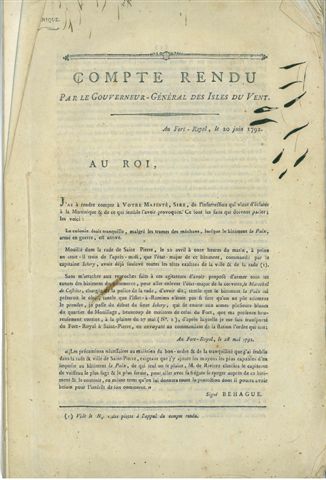 JOINT: Recueil broché de pièces imprimées intitulé Compte-rendu par le gouverneur-général des Isles du Vent, au Fort-Royal 20 juin 1792, 35 pages in-fol. - L.A. par DORIENT, Sainte-Anne 16 avril 1793 - L.A.S. par la veuve PERCIN, chef du parti royaliste, aux Trois-Îlets 30 juillet 1793 ; et certificat joint.