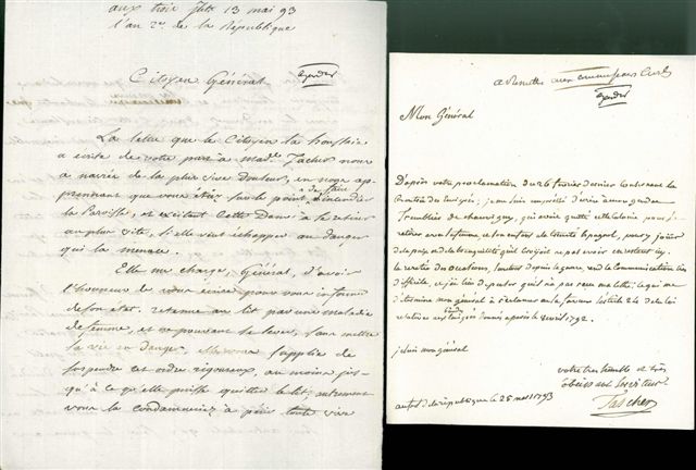 Joint: L.A.S. par MARLET, président du comité de surveillance, aux Trois Îlets 13 mai 1793, 2 pages ½ in-4. Lettre adressée au gouverneur général Rochambeau, lui faisant part de l'inquiétude de Rose-Claire Verger des Sannois épouse Tascher de la Pagerie (mère de l'impératrice Joséphine), de voir sa paroisse incendiée sur ordre du gouverneur général.