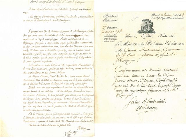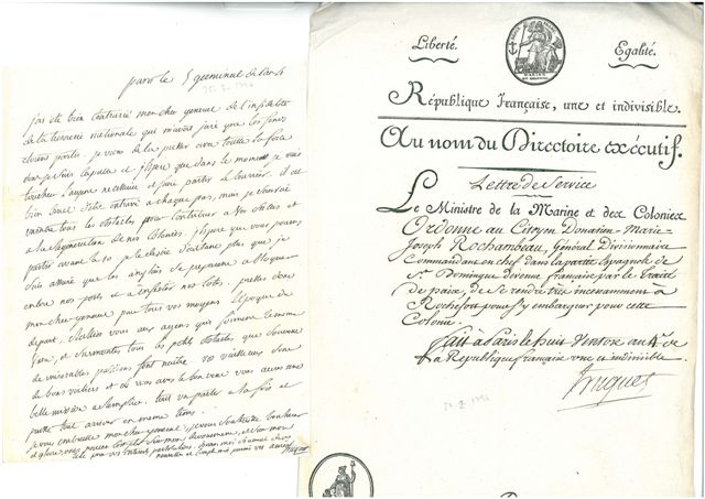 On joint la copie de l'Extrait du registre des délibérations du Directoire exécutif, nommant le général Rochambeau commandant en chef dans la partie de Saint-Domingue devenue française par le traité de paix conclu avec l'Espagne, 12 février 1796 (1 page in-fol.).