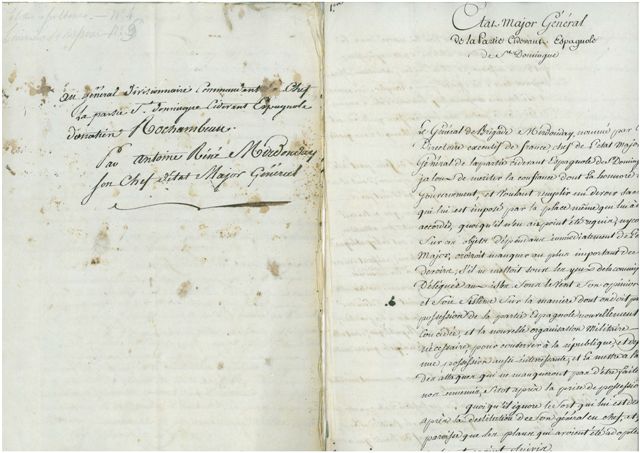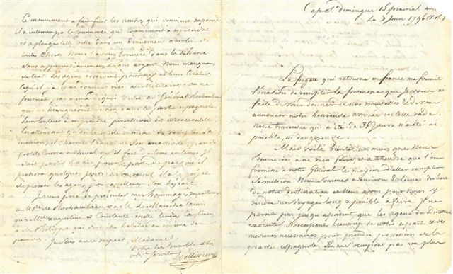 Joint: L.A.S. par DUBOUCHET, Paris 21 avril 1795 - 4 P.S. par FAIN, chef de la division de la correspondance générale du Directoire exécutif, Paris 13 janvier-4 mai 1796 - 2 L.S. par Aubert-Dubayet (griffe) et le général DUVIGNEAU, Paris 24 et 28 janvier 1796, accusé de réception du serment de haine à la royauté et fidélité à la République rendu par le général Rochambeau - 2 P.S. par Aubert-Dubayet (griffe) et CARRA SAINT-CYR, Paris 31 janvier 1796, certificat de dépôt des titres et brevets militaires du général Rochambeau - L.A.S. par DEMESTRE, Monclar 29 février 1796 - 4 L.S. par TRUGUET (1752-1839) ministre de la Marine, Paris 11-24 février 1796 - 2 L.S. par Claude Louis PETIET (1749-1806) ministre de la Guerre, Paris 28 février 1796 (plus pièce jointe) - Mémoire du général de brigade André Rigaud, en réfutation des écrits calomnieux contre les citoyens de couleur de Saint-Domingue, imprimé aux Cayes - Reconnaissance militaire des 4 communes de l'Agabon, St Yago, Portoplatta et Montechrist ( ) suivi d'un projet de système défensif pour cette étendue de côte et de pays, messidor V, 23 pages in-fol. - 6 pièces manuscrites du ministère de la Marine, 1798-1799 (en-têtes et vignettes).