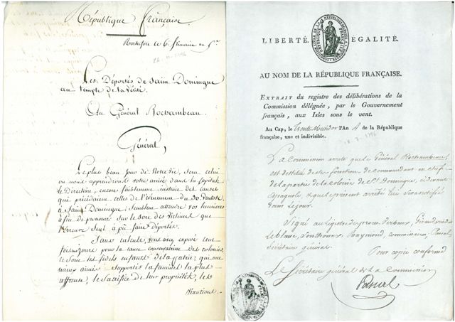 Extrait de registre des délibérations de la commission déléguée signé par LAVEAUX, général en chef au Cap, 21 juin 1796: ordre d'arrestation du général Rochambeau qui sera conduit à bord de la corvette le Berceau. - 2 L.S. par le commandant de la place du Cap LÉONOURT?, 15 juillet 1796 - 2 L.S. par PASCAL, secrétaire général de la commission (qui deviendra un proche conseiller de Toussaint Louverture), 18 et 20 juillet 1796 (en-tête et vignette): la commission arrête que le général Rochambeau est destitué de ses fonctions de commandant en chef de la partie autrefois espagnole. - Ordre donné à LEHOUX, capitaine de frégate de la corvette le Berceau, de laisser l'accès aux visiteurs du prisonnier Rochambeau, 27 juillet 1796. - 2 copies conformes des ordres de transfert au général Rochambeau et son état-major au fort du Ha de Bordeaux, 11 septembre 1796. - 3 pièces manuscrites relatives à la destitution.