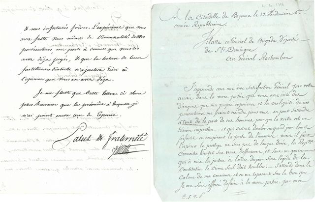 2 L.A.S. par Eugène-Casimir VILLATTE (1770-1834) général de brigade, déporté de Saint-Domingue, citadelle de Bayonne et Rochefort 4 octobre 1796 et 28 janvier 1797 - L.A.S. par François Marie Sébastien PAGEOT (1766-1834) général de brigade mulâtre, au Port-de-Paix 13 octobre 1796: