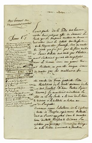 Rare et exceptionnel document relatant la carrière militaire du fils du maréchal de Rochambeau, de 1792 à 1796, dans lequel il développe également ses idées politiques et des réflexions personnelles.