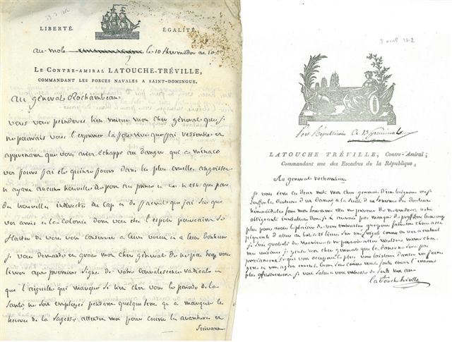 En rade du Cap, à bord du vaisseau le Duguay-Trouin, 9 brumaire (31 octobre). J'ai appris mon cher général avec autant de plaisir votre arrivée au Port-au-Prince que les succès de vos armes. Votre présence vaut une armée (...) Notre position a été très critique pendant quelques instants, mais l'évacuation des différents points de la côte nous ayant ramené quelques troupes, nous sommes en mesure de nous maintenir au Cap, chose que j'ai cru un instant problématique. (