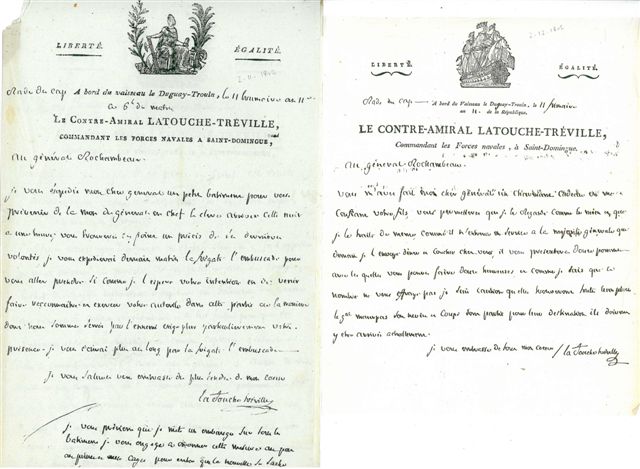 2 manuscrits autographes de Latouche-Tréville: Nottes indicatives de quelques moyens pour rétablir et assurer la culture de St Domingue après la soumission des rebelles (4 pages in-fol.), et Travail de la marine, matériel (4 pages in-fol., signé).