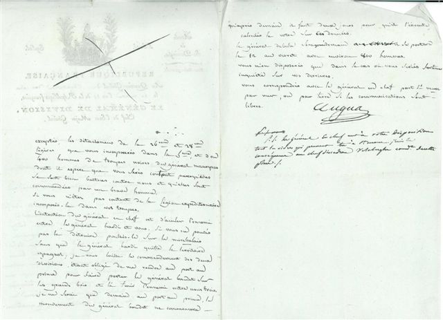 Q.G. de la Chaumière 17 messidor X (6 juillet 1802). D'après la nouvelle distribution des commandements et des troupes qui vient d'être arrêtée par le général en chef, vous aurez sous vos ordres, mon cher général, le département du sud et celui de l'ouest, en exceptant de ce dernier la partie que commandait le général Brunet. Vous aurez sous vos ordres les généraux ci-après: les généraux de division Desbureaux et Dessalines, les généraux de brigade Boyer, Charles Belair, Clairvaux, Laplume, Rey et l'adjudant commandant Darbois faisant fonctions de général de brigade. Vous aurez sous votre commandement les troupes désignées de l'autre part: le bataillon de la 90e, le bataillon de la 56e, le bataillon de la 19e légère, le bataillon de la 15e légère, le bataillon de la 68e, la 5e légère, le bataillon de la 71e, le bataillon de la 79e. Plus les différents corps de noirs qui sont ou devront être incorporés à la suite de ces bataillons. Ces troupes devront être disposées ainsi qu'il suit: Division du général Dessalines qui conservera les limites qui lui ont été déjà assignées: 5e légère et 71e de ligne plus les troupes noires attachées à ces deux corps. Le général Rey sera employé à cette division. Vous pourrez donner le commandement de l'arrondissement du Port Républicain ou de celui de Jacmel au général Boyer. Vous pourrez placer le général Clairvaux à Léogane. Vous tiendrez au moins un bataillon dans chacun des points de Jérémie et de Jacmel, en raison de leur salubrité. (...) tout homme chez lequel il sera trouvé un fusil ou de la poudre, dix jours après l'affiche de votre proclamation, sera puni de mort ; les exécutions auront lieu devant l'atelier, si c'est un cultivateur ; et dans la place publique, si c'est un habitant d'une ville ou d'un bourg. (...) Vous ferez également fusiller impitoyablement tous ceux qui chercheraient à former des partis, et insurger les ateliers, et en exemple devront toujours se faire de manière à inspirer la plus grande terreur.