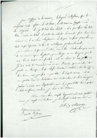 Marseille 18 ventôse X (9 mars 1802). Salut et amitié, mon cher général, il semble qu'une fatalité toujours constante nous sépare l'un de l'autre. Pendant que j'étais en Egypte, tu étais en Italie ; actuellement que je suis rentré en France, tu es parti pour les Antilles. Je t'y souhaite joie, santé, prospérité. Tu connais bien les colonies, tu y rendras des services importants. J'ai été obligé de capituler dans une dont la possession eut été bien importante pour la France (...) Au reste je n'ai rien à me reprocher, je n'ai rendu la ville d'Alexandrie que lorsqu'il n'y existait plus ni vivres ni eau, et que les troupes y étaient réduites à moins de 1800 hommes, encore presque tous scorbutiques. J'étais attaqué sur terre par 30 000 hommes et sur mer par environ 200 bâtiments de guerre de toute grandeur.