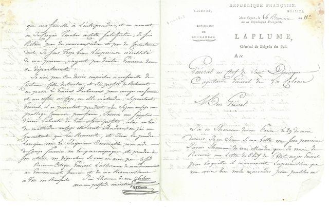 Martial BESSE comte de Sainte-Suzanne (1759-1816) général de brigade mulâtre. L.A.S, Saint-Marc 19 juin 1802 ; 4 pages in-fol., en-tête.