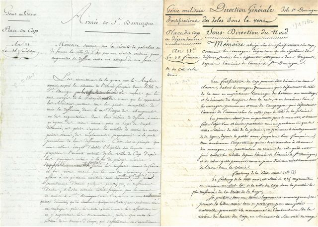 - Antoine MOULUT (1761-1825) chef de brigade, sous-directeur du génie du Nord. 3 L.A.S. et 2 L.S. dont un Mémoire abrégé sur les fortifications du Cap et un Mémoire succinct sur la nécessité de palissades ou de fermer la ville du Cap par une enceinte continue, 1er décembre 1802-2 septembre 1803 ; 4 pages in-8 et 21 pages in-fol.