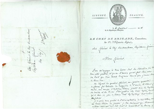 28 prairial X (17 juin 1802). Un officier général soit de votre division ou de l'armée de St Domingue a répandu le bruit ici que vous m'en vouliez sur plusieurs propos que j'avais tenus (...) Il paraît que la calomnie exerce conte moi son poison. C'est la jalousie je crois qui l'excite contre un homme qui de sa vie n'a rien eu à se reprocher. Je viens encore d'éprouver ces coups auprès du général Leclerc. J'étais employé ou je devais me regarder comme tel dans la gendarmerie une place d'officier supérieur m'y était destinée, par une fatalité attachée à mon nom, je me trouve par ordre du général rayé du dessus de la liste des officiers à employer, l'on me dit encore que c'est pour des propos l'on me renvoie ma pétition, l'on ne m'écoute pas et je suis réformé. (