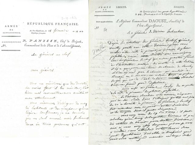 ON JOINT: 2 L.A.S. et 2 P.S. par Marie Martin Antoine ANDRIEU (1768-1802) adjudant-général, chef de l'état-major des divisions de l'Ouest et du Sud, 1er mars-12 mai 1802, dont copie conforme de lettre de Leclerc à Dessalines - 3 L.A.S. par DAOUST, adjudant-commandant, sous-chef de l'état-major général,10-22 mars 1802 - 16 L.A.S. par Pierre PANISSE, chef de brigade et commandant la place de Port-Républicain, beau-frère du général Fressinet, 15 septembre 1802-19 octobre 1803 ; 50 pages in-4 ou in-fol. dont de nombreux rapports sur la situation militaire - L.A.S. par SACQUELEU, adjudant-général, chef de l'état-major de la division d'Artibonite et du Sud, au Port-Républicain 2 novembre 1802, annonce du décès du général Watrin. - L.A.S. par NETHERWOOD, chef de brigade, premier aide-de-camp du général Rochambeau, 2 décembre 1802 - L.A.S. par DELPECH, chef de bataillon, commandant d'arrondissement du Petit-Goave, au Petit-Goave 11 février 1803 - L.A.S. par BRUNIER, capitaine adjudant, à la Tortue 27 février 1803 - L.A.S. par François FÉLIX, chef de brigade, directeur de l'artillerie du Cap, au Cap 18 avril 1803 - 2 L.A.S.par DUMONT, adjudant-commandant, au Fort-Dauphin 24 juin-15 juillet 1803 (très abîmées) - L.S. par Joseph VALDONY, chef de brigade, commandant d'armes, 18 juillet 1803 - L.A.S. par MAILLARD chef de l'état-major de la division du Nord, 23 juillet 1803 - 2 L.A.S. de LUX, chef de brigade, commandant la 5e d'infanterie légère, 22 août 1803 - L.A.S. par BERGER, chef de brigade, Port-au-Prince 27 septembre 1803 - L.A.S. par Gilbert NÉRAUD, adjudant-commandant, commandant la garde du général Rochambeau, au Cap 15 novembre 1803. Plus une affichette imprimée au Cap (32 x 39,5 cm).