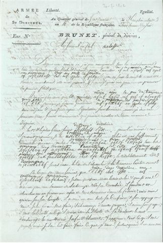 Très intéressante correspondance relative au traquenard monté par les généraux Leclerc et Brunet pour capturer Toussaint Louverture et ses proches, au désarmement, à l'épidémie, rapport sur les opérations militaires, articles de la capitulation entre Brunet et Cumberland
