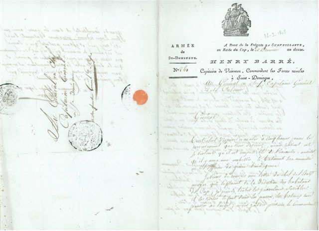 Jean Baptiste GEMON (1769-?) lieutenant de vaisseau et commandant le brick de l'Etat le Goëlan. L.A.S., aux Cayes 3 décembre 1802 ; 1 page in-4, adresse.