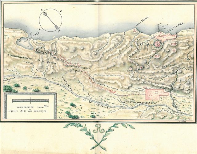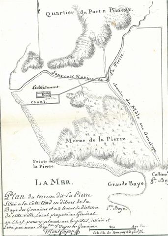 Plan du terrein dit la Pierre situé à la côté nord en dehors de la baye des Gonaïves et à 2 lieues de distance de cette ville, local proposé au général en chef pour y placer un hôpital, dessiné et levé par nous arpenteur et voyer des Gonaïves. Crayon et plume. Signé Montfayon. 19,5 x 32,5 cm.