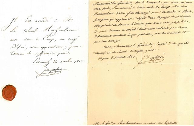 Monsieur le général, sur la demande que vous m'en avez faite, j'ai accordé à mon aide de camp M. de Rochambeau votre fils un congé pour se rendre à Paris. Je ne puis qu'approuver l'objet de ce voyage et je verrai avec plaisir se former l'union que vous avez projetée. Ce jeune homme a mérité tout mon intérêt par son dévouement constant à ma personne, par sa conduite et par son courage. Sur ce, Monsieur le général, je prie Dieu qu'il vous ait en sa sainte et digne garde.