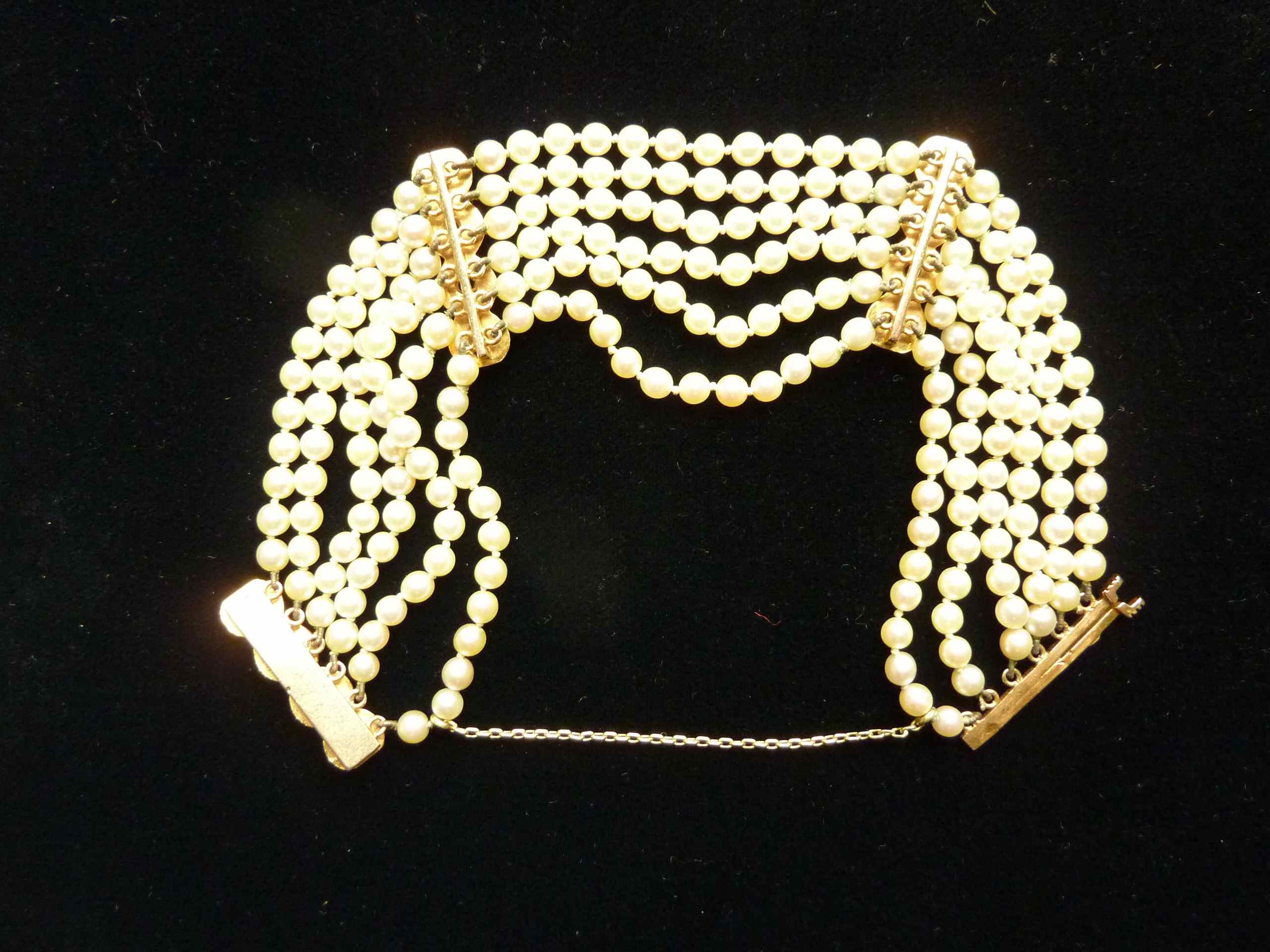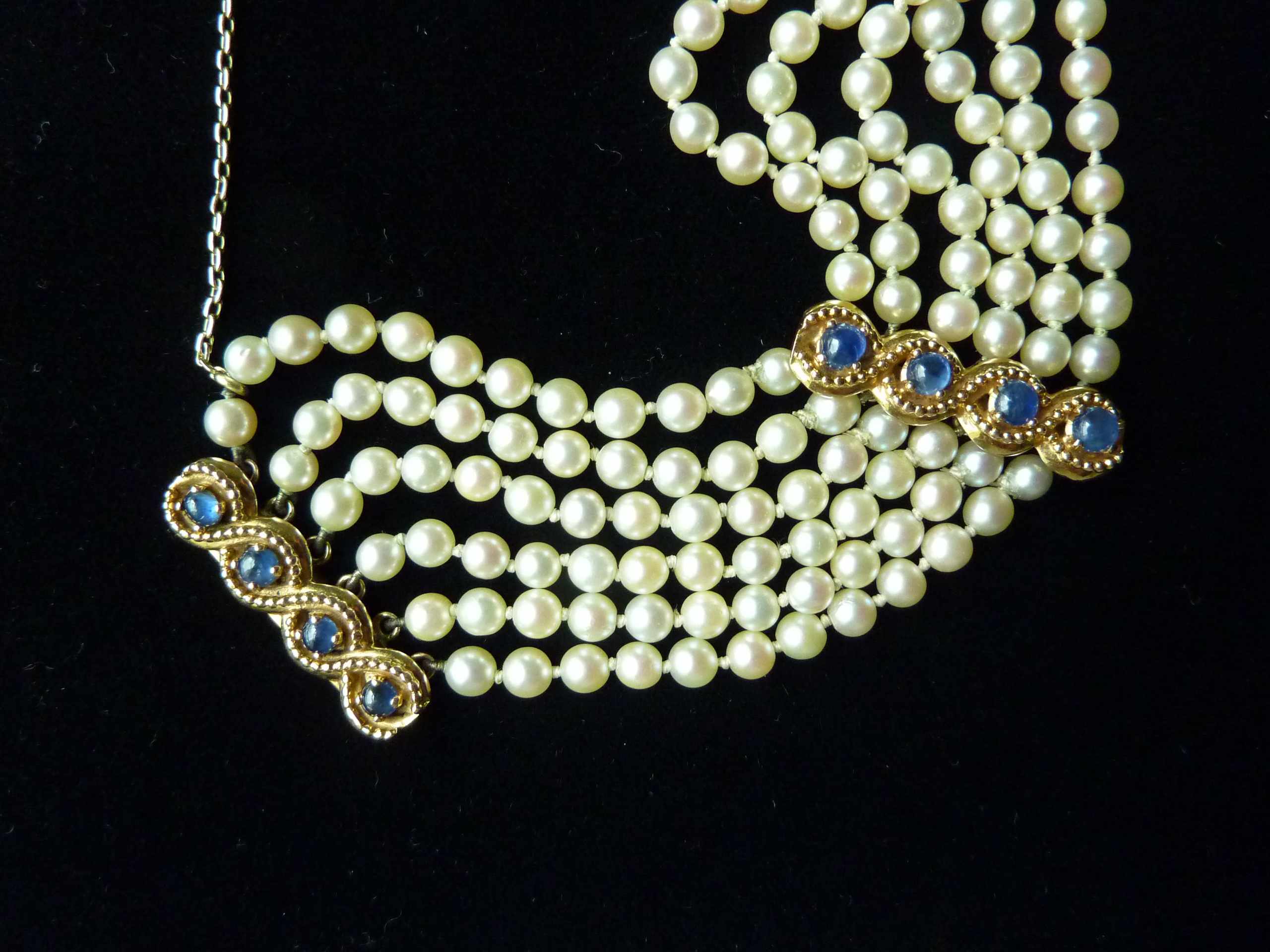 BRACELET composé de six rangs de perles de culture, orné de deux intercalaires et d'un fermoir en or jaune serti de saphirs cabochons.