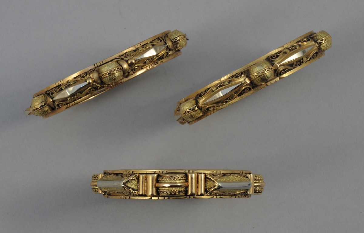 Lot de trois BRACELETS rigides en or à décor de filigranes et motifs géométriques.