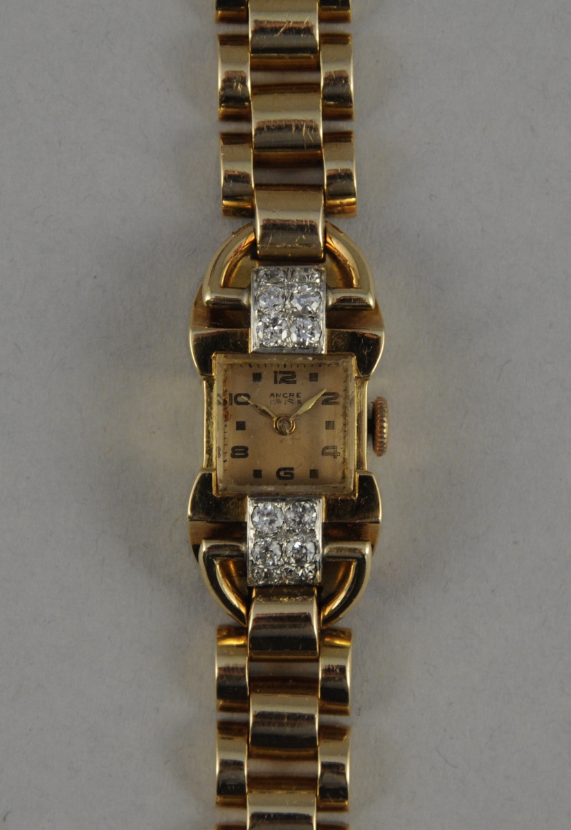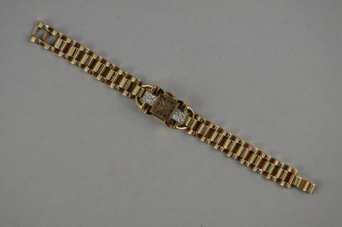 MONTRE-BRACELET de dame en or jaune, la montre, de forme carrée, les attaches serties de douze petits diamants de taille ancienne, le tour de poignet articulé.
